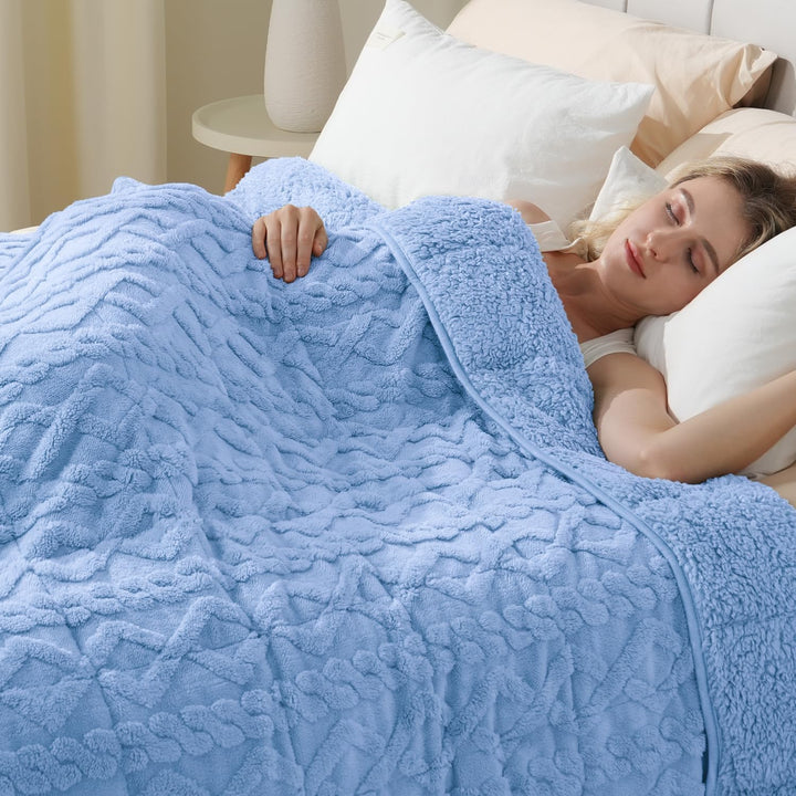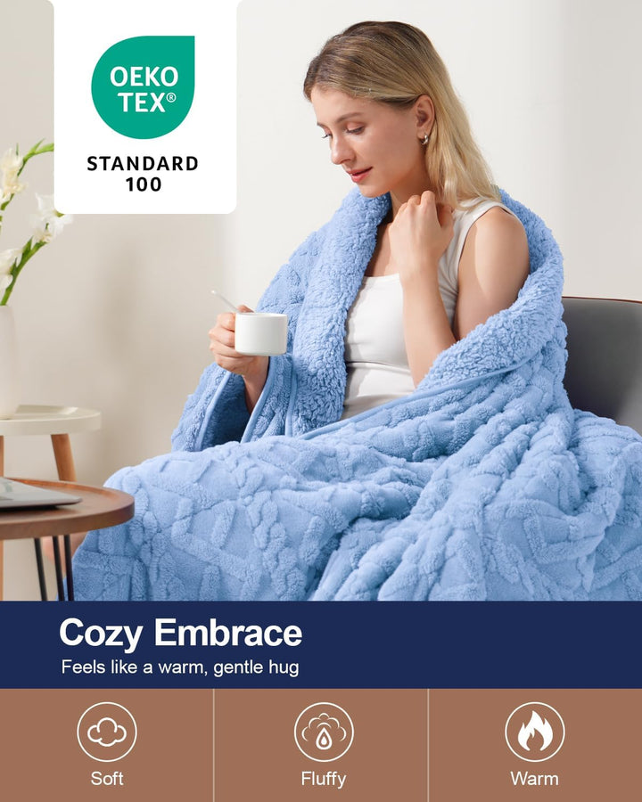 Crafted with Sherpa fabric on both sides, this blanket combines luxury and comfort. The top side features an elegant tufted cable pattern, while the reverse offers a classic grid design. The 12 lb, 15 lb, and 20 lb weighted blankets are plush, soft, and oversized, making them a stunning addition to your home decor. Resistant to pilling, fading, and stains, these blankets are designed to last, adding a cozy and classy ambiance to any space.