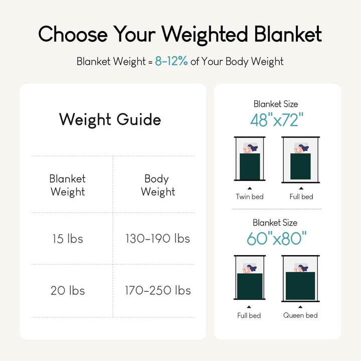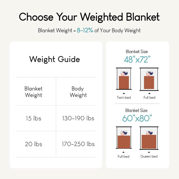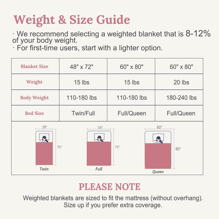 Weight & Size Guide: Choose a blanket that's about 10% of your body weight for optimal comfort. If you're unsure, opt for the lighter one. Weighted blankets are designed to fit the mattress (without overhanging), so size up if you prefer extra coverage