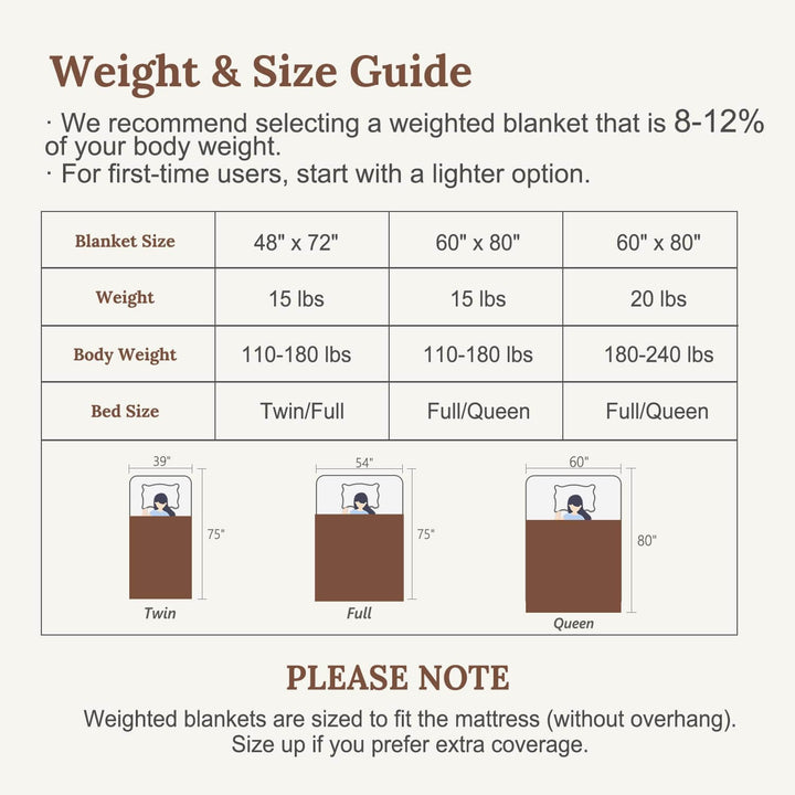 Weight & Size Guide: Choose a blanket that's about 10% of your body weight for optimal comfort. If you're unsure, opt for the lighter one. Weighted blankets are designed to fit the mattress (without overhanging), so size up if you prefer extra coverage