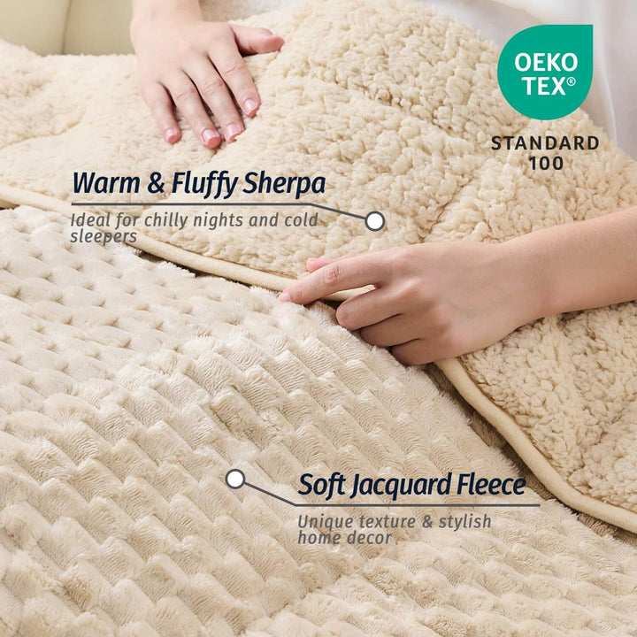 The top layer features luxurious 320GSM bubble faux fur with a wave-like texture that is soft and visually appealing. The bottom layer is made from 220GSM warm Sherpa, offering cozy comfort during the coldest nights. Plus, it's resistant to fading, shedding, and static for lasting quality.