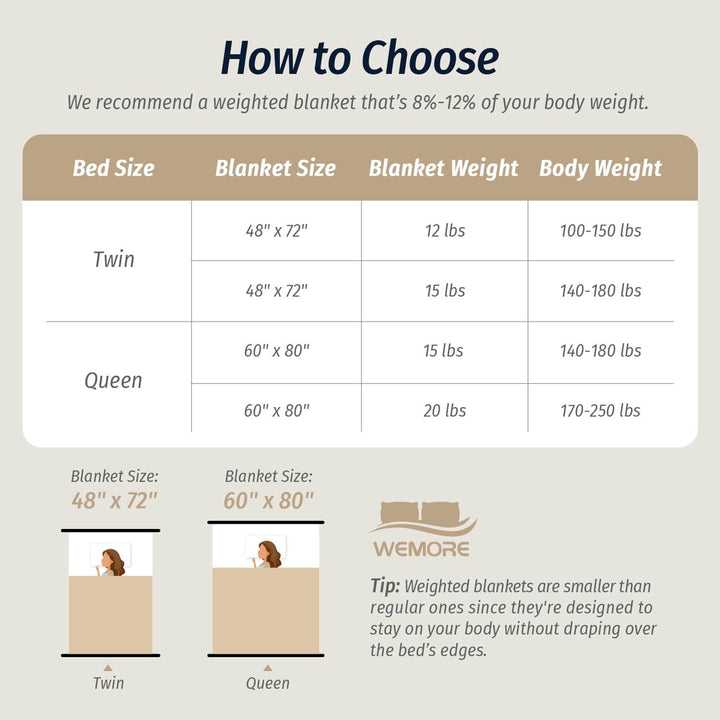 If you often layer blankets for extra warmth or weight, consider switching to this all-in-one solution. Choose a size that matches your bed and weight (8-12% of your body weight is recommended for the best experience). Easy to maintain, simply machine wash on gentle with cold water and tumble dry on low or spot clean as needed.