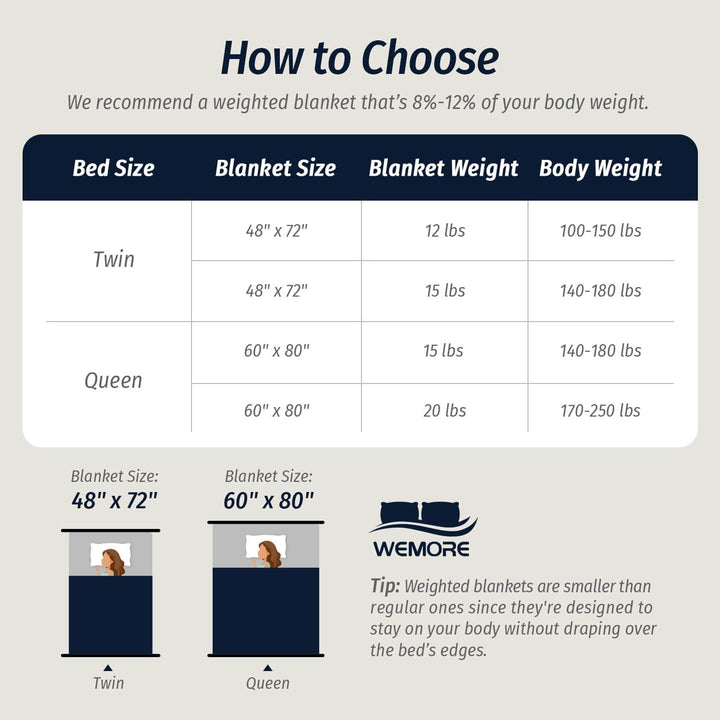 If you often layer blankets for extra warmth or weight, consider switching to this all-in-one solution. Choose a size that matches your bed and weight (8-12% of your body weight is recommended for the best experience). Easy to maintain, simply machine wash on gentle with cold water and tumble dry on low or spot clean as needed.