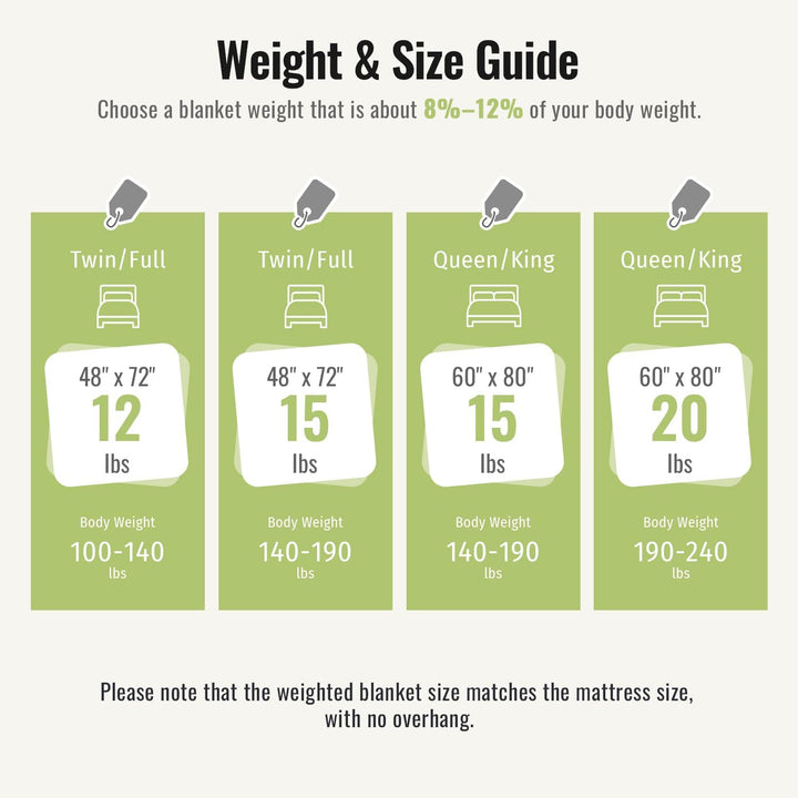 Our weighted blanket is available in 12 lb, 15 lb, and 20 lb options, making it easy to choose the perfect weight for your needs. We recommend selecting a blanket that is approximately 10% of your body weight plus 1 pound. For example, a 12 lb blanket is ideal for individuals weighing 100-140 lbs, a 15 lb blanket for those weighing 140-190 lbs, and a 20 lb blanket for individuals 190-240 lbs. Available in multiple sizes and colors, this blanket is perfect for personal use, family use, or as a gift.