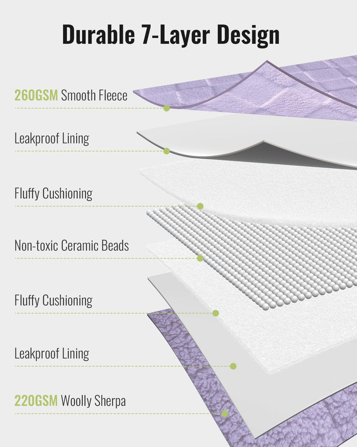 • 7-Layer Construction: Our innovative 7-layer design uses 1mm ceramic beads encased in small squares, ensuring even distribution without clumping. The beads are sandwiched between non-glue polyester layers to perfectly contour to your body’s shape.
