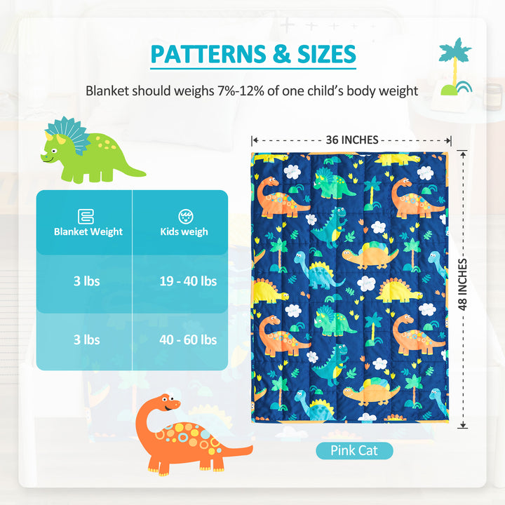 Versatile Sizing & Options: Choose from three sizes and weights to suit your child’s needs: 3lbs (36" x 48"), 5lbs (36" x 48"), and 7lbs (41" x 60"). These blankets are ideal for kids weighing between 19lbs - 40lbs (3lbs), 40lbs - 60lbs (5lbs), and 60lbs - 80lbs (7lbs). Available in three colors and patterns, you can pick the perfect one to suit their personal preferences.